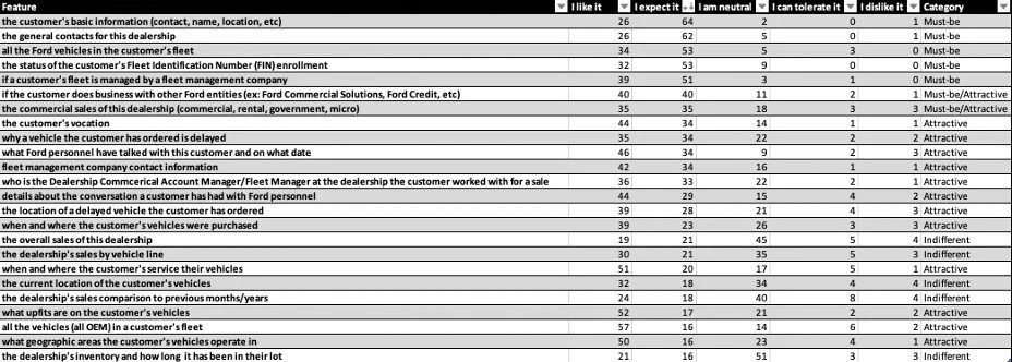 Attractive (Delighters): Features that significantly enhanced the experience, like vehicle upfit details.
